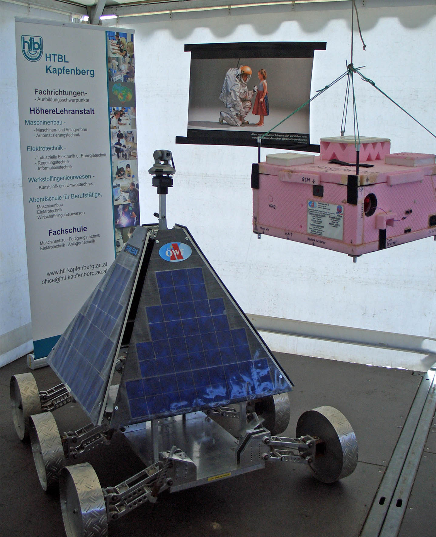 Rechtzeitig zum Start der Vorführungen ist aus der Baustelle eine ansehnliche Leistungsschau des Österreichischen Weltraum Forums geworden. Der Rover „Phileas“ wird so präsentiert, wie er von Rio Tinto zurück gekommen ist – leicht lädiert und sehenswert rostig. In der Mitte des Zelts hängt die Gondel eines Passepartout Höhenforschungsballons mit blinkenden Positionslichtern und Radarreflektor – so wie er letztes Jahr auf der Teichalm geborgen wurde. Und als besondere Leihgabe von Liquifer ziert ein Schlafsack für Astronauten – lebensgroßes männliches Modell inklusive – eine der Zeltwände. Poster vervollständigen die Inneneinrichtung, Folder liegen bereit und unser ÖWF Promotion-Clip sowie das Passepartout-Video (einmal Stratosphäre und retour) laufen im Dauerloop.